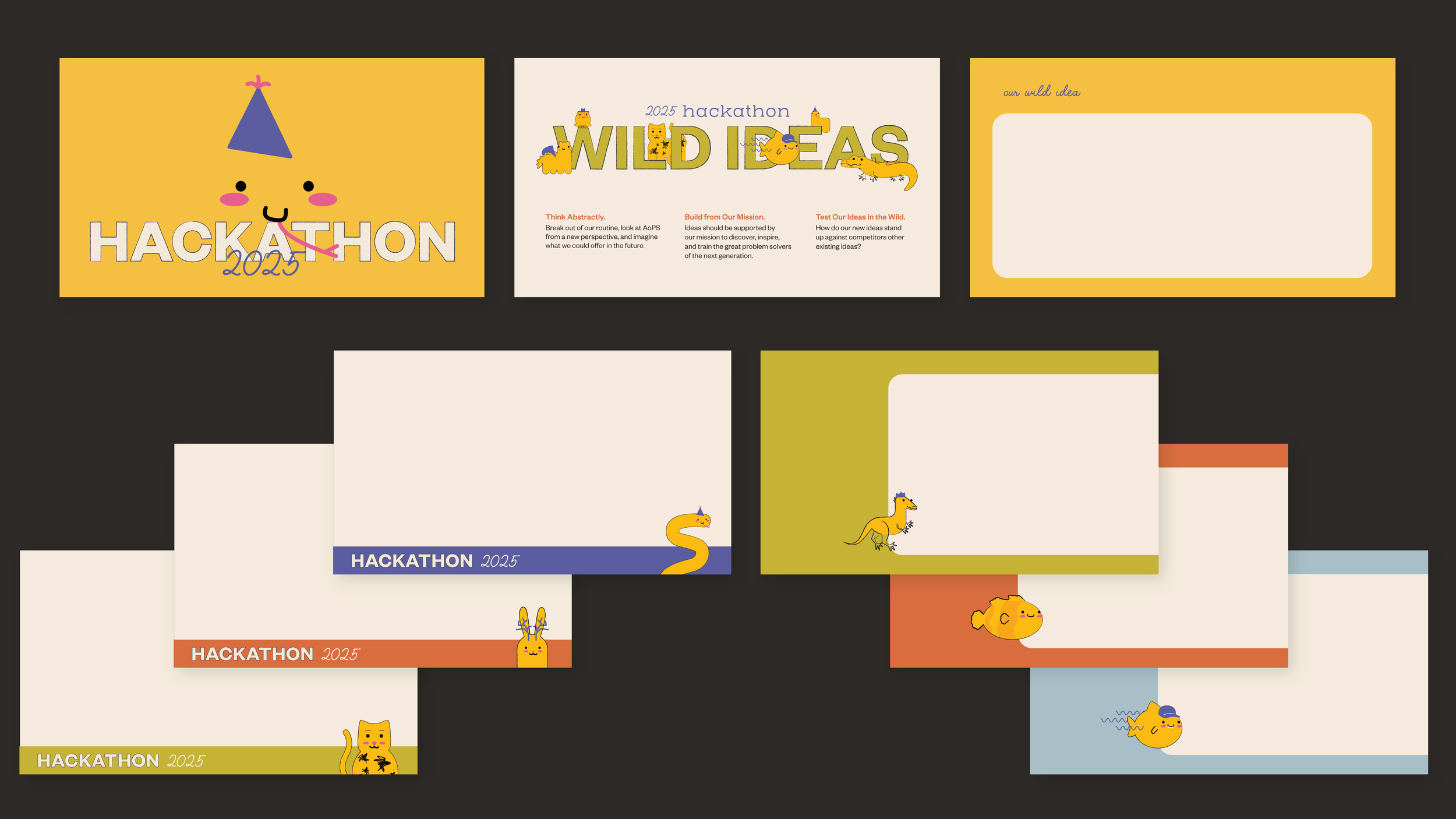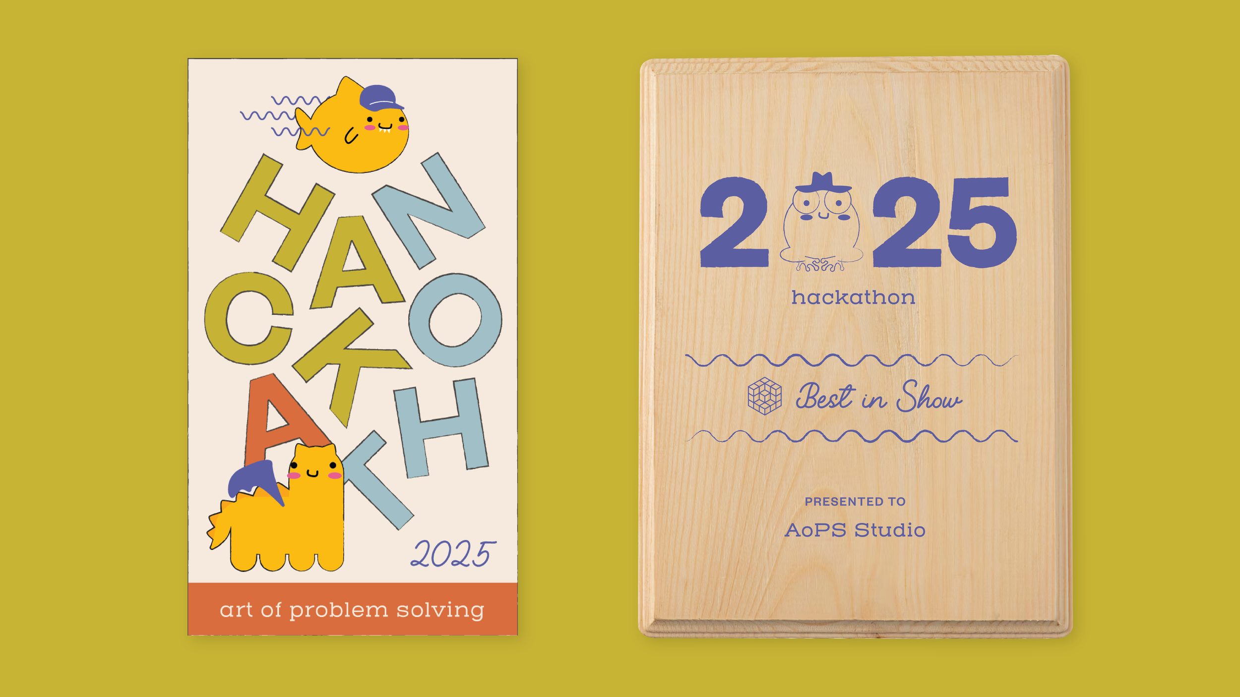 Each year Art of Problem Solving hosts a ‘Hackathon’ where anyone in the company can form or join a team to build something new in one week. This campaign explores what wild ideas can happen when people from different teams work together. The concept represents our internal structures with illustrated team mascots, or wild animals. They playfully interact with the three phases of Hackathon in unexpected ways (think, build, test). Their joyful, crude nature makes them easy to love. The letters are stacked unusually to encourage people to look at things differently. The cuteness of the overall campaign draws in anyone across departments to participate. Overall the campaign was a success at boosting morale and garnering excitement around prizes featuring team mascots.